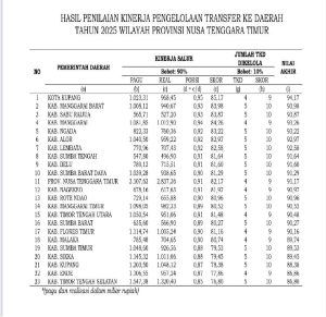 Dalam penilaian tahun ini, Kota Kupang unggul dari daerah lainnya di NTT. Kabupaten Manggarai Barat menempati posisi kedua dengan nilai 93,98, dan Kabupaten Sabu Raijua di posisi ketiga dengan nilai 93,87. Selisih nilai yang tipis menunjukkan persaingan antardaerah semakin ketat dalam menghadirkan tata kelola anggaran yang transparan dan akuntabel.