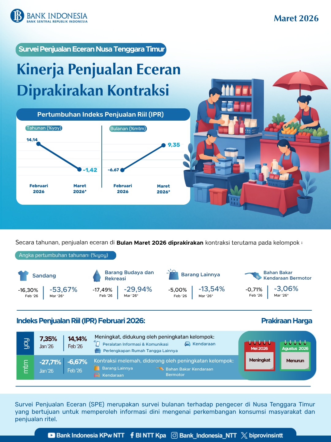 Dalam rilis Bank Indonesia Perwakilan NTT yang dibagikan kepada media disebutkan, secara bulanan, kinerja penjualan eceran di Nusa Tenggara Timur pada Maret 2026 diprakirakan meningkat sebesar 9,35% (mtm) dari bulan Februari yang sebesar -6,67% (mtm). Kinerja penjualan eceran tersebut dipengaruhi oleh peningkatan kinerja mayoritas kelompok, diantaranya Kelompok Sandang; Makanan, Minuman, dan Tembakau; Suku Cadang dan Aksesori; Bahan Bakar Kendaraan Bermotor; Kendaraan; Barang Lainnya; Barang Budaya dan Rekreasi; serta Perlengkapan Rumah Tangga Lainnya. Prakiraaan IPR NTT sejalan dengan prakiraan IPR Nasional pada Maret 2026 yang turun sebesar 2,4% (yoy) dan meningkat sebesar 9,3% (mtm), sejalan dengan peningkatan permintaan masyarakat saat Ramadan dan HBKN Idulfitri 1447 H.